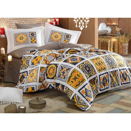 У модели Mozaique Sari коричневая простынь и низ пододеяльника, а верх поделён на квадраты с сине-жёлтыми узорами. Изготавливается в полуторном, евро и семейном размерах.