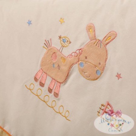 Набор постельного белья в детскую кроватку для новорожденных "Пони" имеет прекрасную объемную 3D-вышивку маленькой пони и вышитую маленькую птичку, напевающую веселыми нотками вышитые цветными буквами дифирамбы своему другу: "My Pony... My best Friend". Пододеяльник с белой вставкой, обшитой красивыми цветными лентами. Посреди вставки вышита 3D-вышивка обаятельной пони с неразлучным другом - птичкой, везде сопровождающей нашу пони. Кроме объемной вышивки имеется красивая разноцветная надпись Pony.
