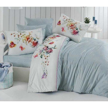 В комплект входит большая простыня 240х260 см, пододеяльник с белой вставкой, украшенной бабочками, порхающими над цветами, и 4 наволочки, две из которых голубые жаккардовые, а две - с цветами на белом фоне.