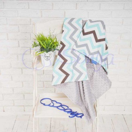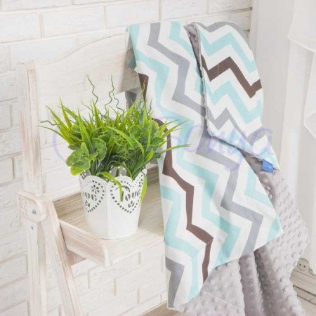 Модель "Minky Premium Indigo голубой" двусторонняя: с одной стороны изделие из натуральной хлопковой ткани с изображением белых, серых, голубых и тёмно-коричневых зигзагов, а с другой - мягкая плюшевая подкладка из польской ткани серого цвета. Идеально подходит для мальчика.