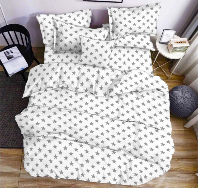 Комплект ST393 с серыми звёздами на белом фоне из натурального хлопка.