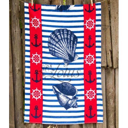 Модель "Ocean Breeze" размером 75*150 см выполнена в синюю полоску на белом фоне с морской атрибутикой на ярко-красных полях по бокам.