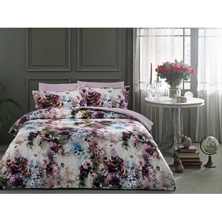 Модель "Carolyn V01" фиолетовых тонах. Однотонная простынь и усеянный цветами пододеяльник.