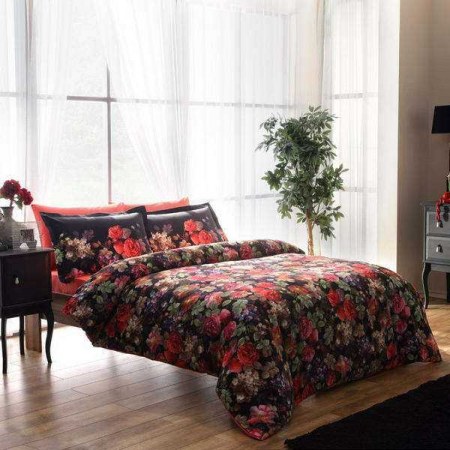 Модель Despina V01 Fusya выполнена в тёмных тонах. Красная однотонная простынь и чёрный пододеяльник усеянный розами разных оттенков.