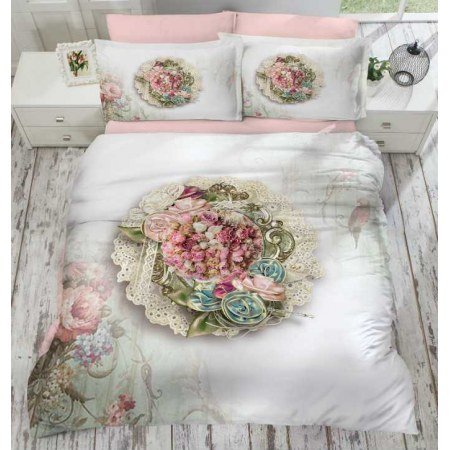 Модель "Firuze" выполнена в пастельных тонах с объёмным рисунком в виде шикарных букетов на пододеяльнике и двух наволочках. Ещё две наволочки и простыня пошиты из однотонного розового полотна с коралловым оттенком.
