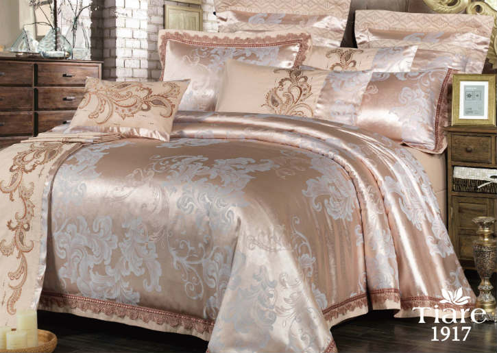 Модель 1917 бежевого цвета. Пододеяльник без канта, вышивки и кружев. Двухсторонний: верх жаккардовый, низ из однотонного гладкокрашенного сатина. Простынь также без рисунка.