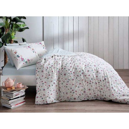 Модель "EJulie V02 Mint" выполнена в светлых тонах. Голубая однотонная простынь и низ пододеяльника, верх пододеяльника белый в мелких цветочках.