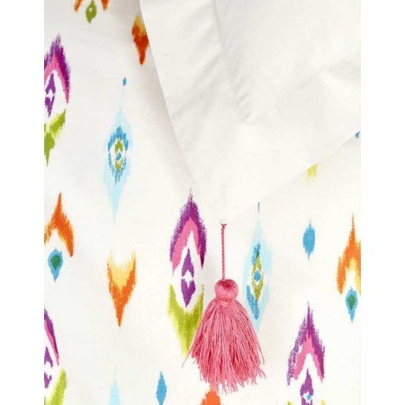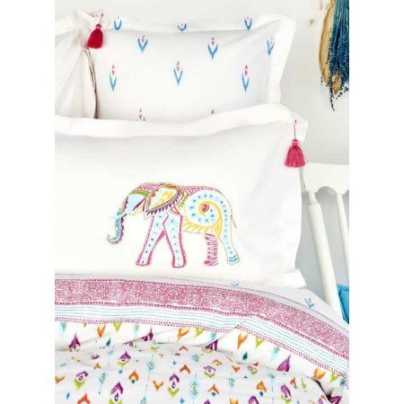 Модель "Nora" выполнена из ранфорса в восточном стиле. Наволочки с ушками и помпонами, на белом фоне изображён индийский слон. Лёгкое хлопковое пике белого цвета украшают мелкие цветастые полоски. Оно прекрасно подходит для жарких ночей знойным летом в виде одеяла, а зимой сможет выполнять свои прямые обязанности.