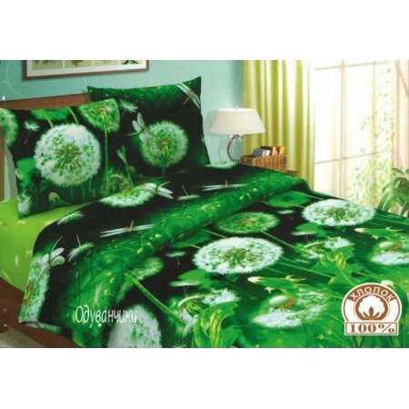 У модели "Одуванчики" салатовая простынь, а пододеяльник и наволочки тёмно-зелёные с большими одуванчиками. Выполнен набор из прочной хлопчатобумажной ткани, устойчивой к стирке в горячей воде до 90 градусов.