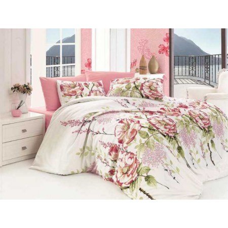 Модель "Sinem" представлена в нежной расцветке. Розовая простынь и белый с розовыми цветами пододеяльник.