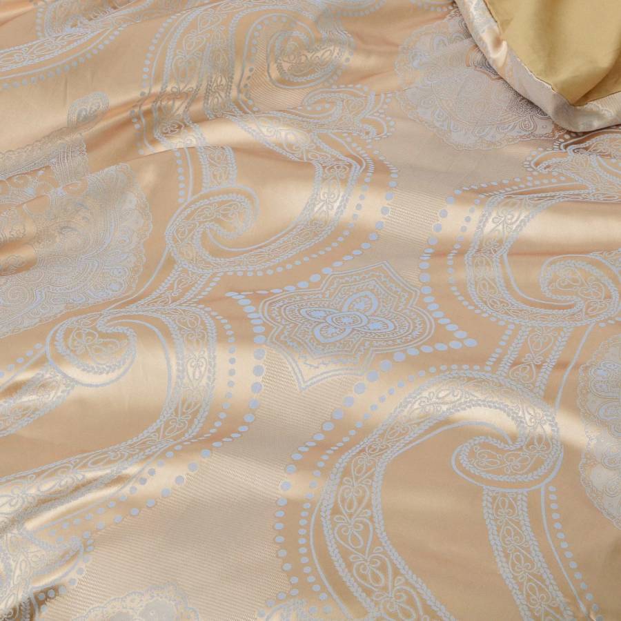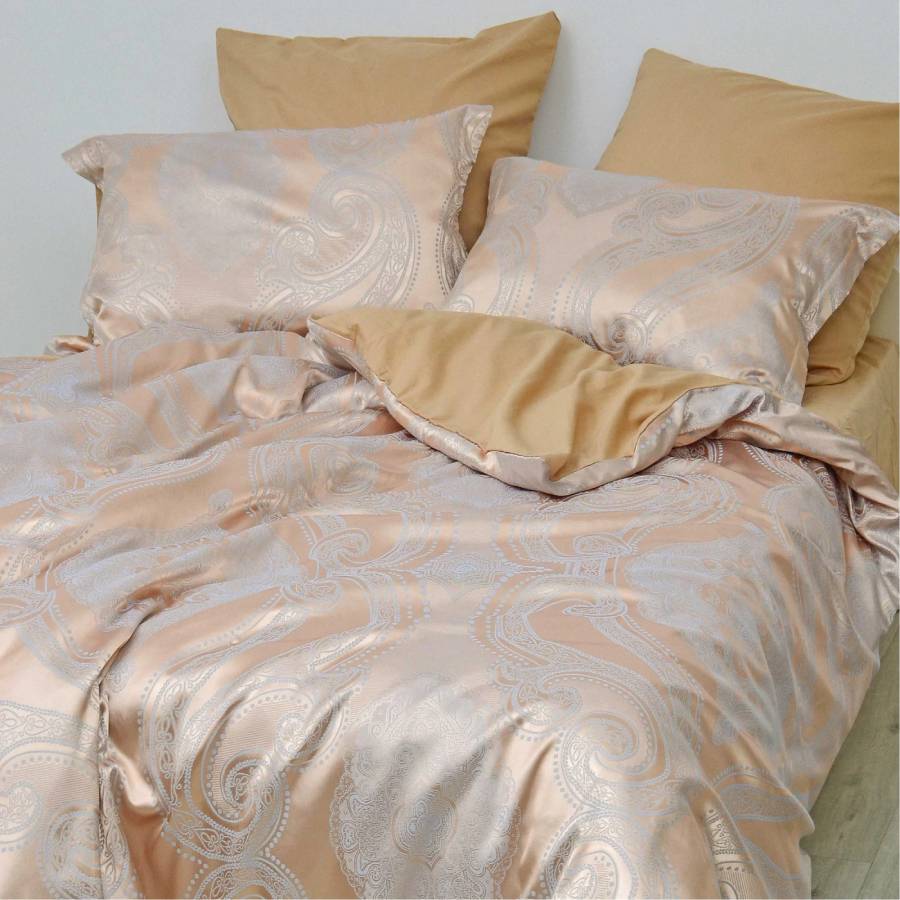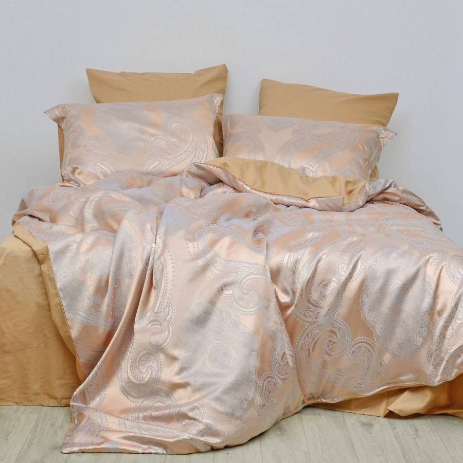 Модель 2113 с изящными узорами на персиковом фоне. Простыня и низ пододеяльника из гладкокрашеного сатина цвета капучино (беж, золотой).
