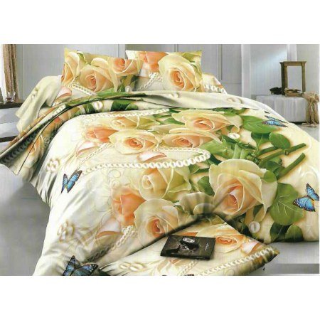 Комплект 251137 бежевого цвета с объёмным изображением бежевых роз с зелёными листиками.