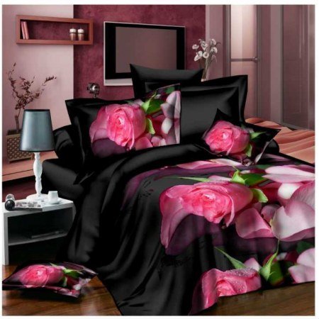 Комплект Дамаск чёрного цвета с объёмным изображением больших розовых роз.