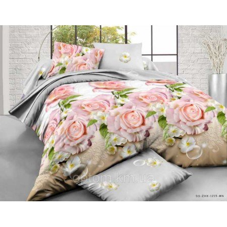 У 3D комплекта 251712 простынь серая а пододеяльник бежевый с объёмным изображением светло-розовых роз.
