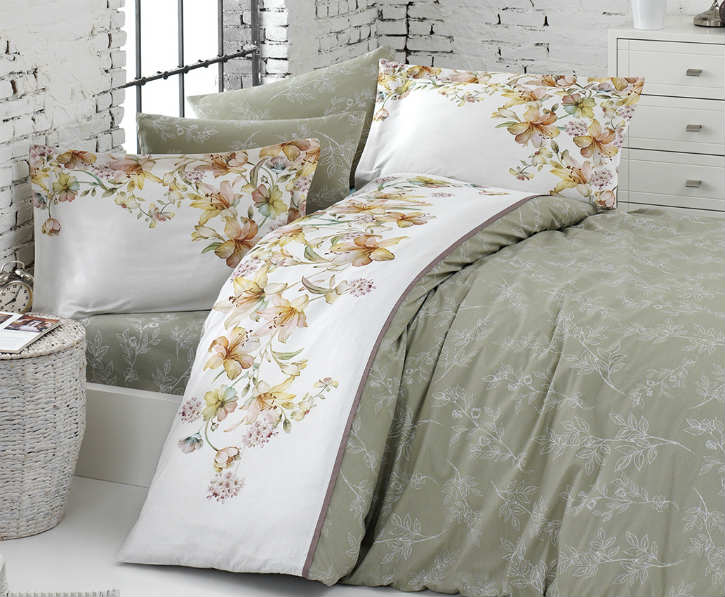 Данная модель тёмного фисташкового цвета с широкой белой вставкой в верхней части пододеяльника.