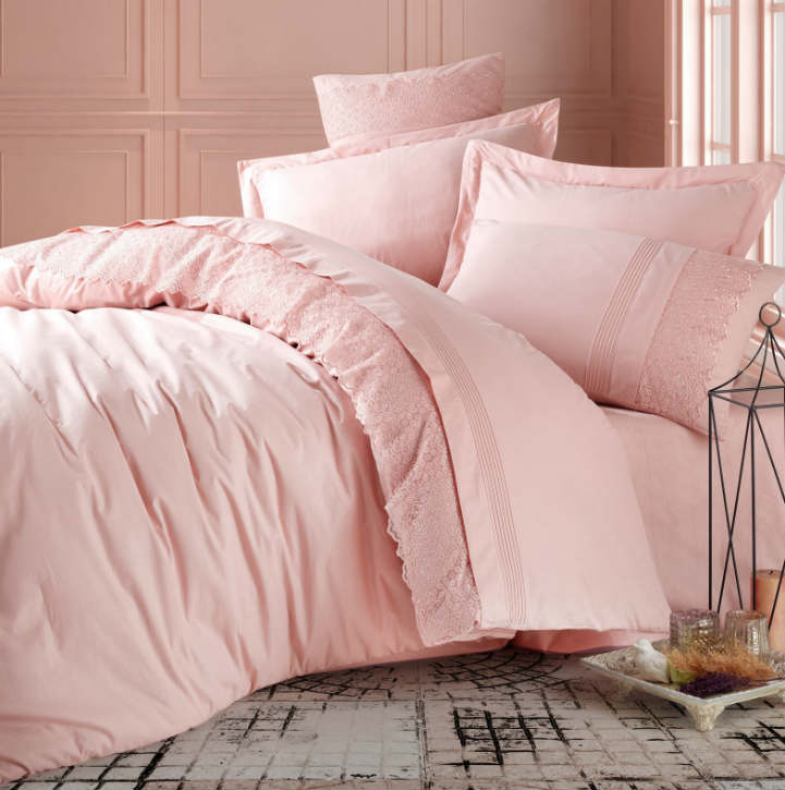 Модель Elba Pudra розового цвета с вышивкой и кружевом на пододеяльнике.