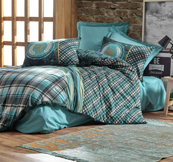 Модель Enrico бирюзового цвета с клеткой на пододеяльнике.