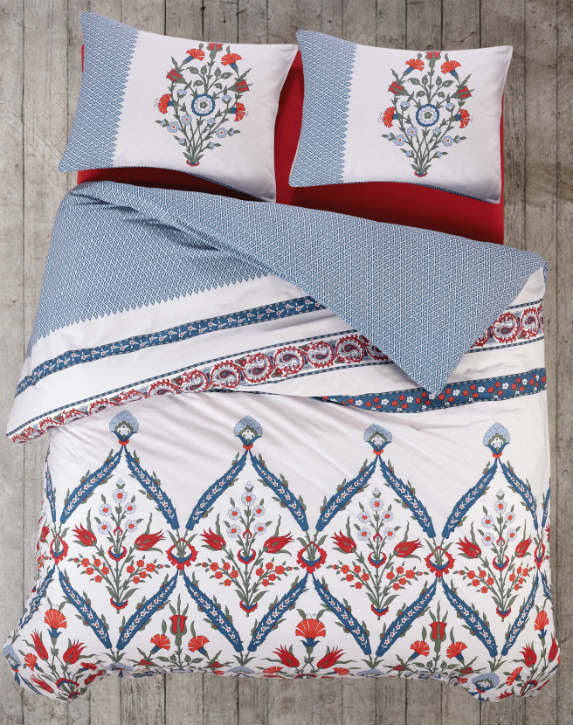 У модели Mahber красная простынь и бело-голубой пододеяльник.