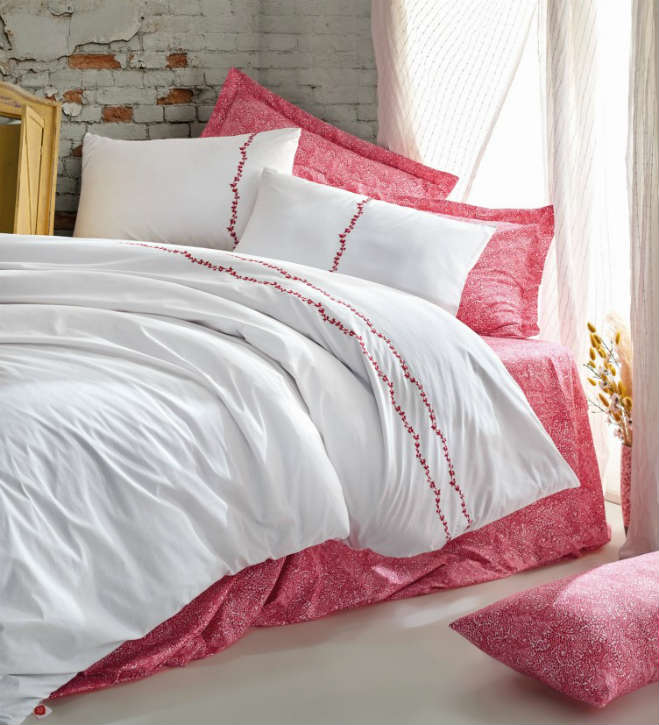 У модели Coco Mercan розовая простынь и белый пододеяльник с вышивкой.