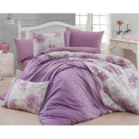 Комплект "Ria Pudra" выполнен в нежной сиреневой расцветке. Пододеяльник двухсторонний: одна сторона в тон простыни и двух наволочек, а вторая - в тон ещё двух (узких) наволочек.