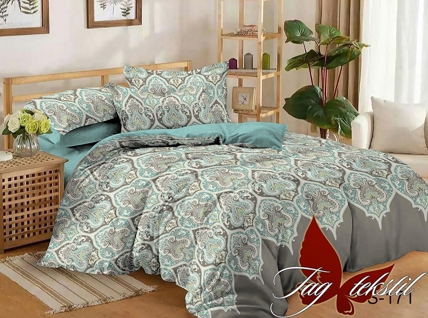 У модели S171 тёмно-бирюзовые простынь и низ пододеяльника, а верх серый с бирюзовым орнаментом.