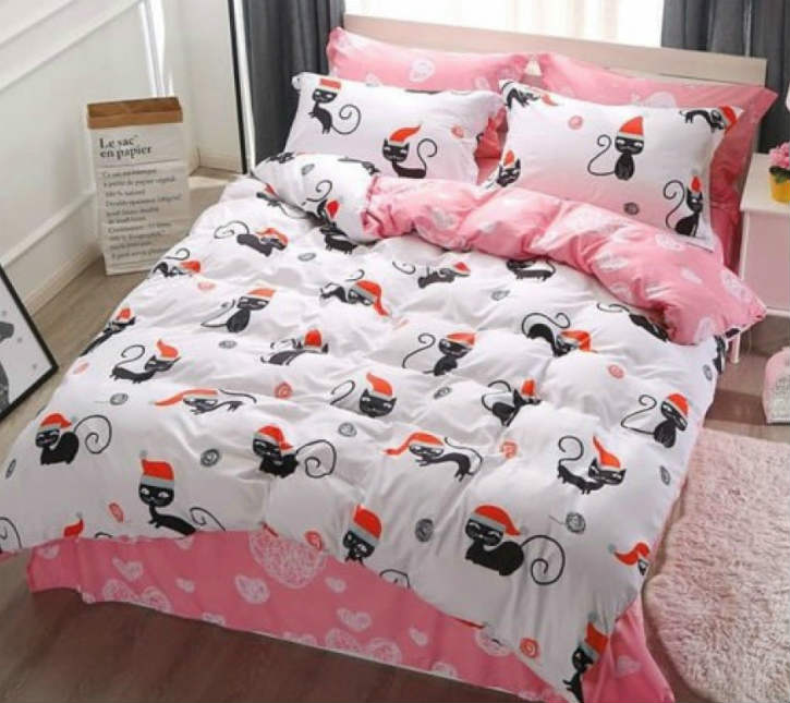 У модели ST233 простынь и низ пододеяльника розовые с сердечками, а верх белый с чёрными котиками.