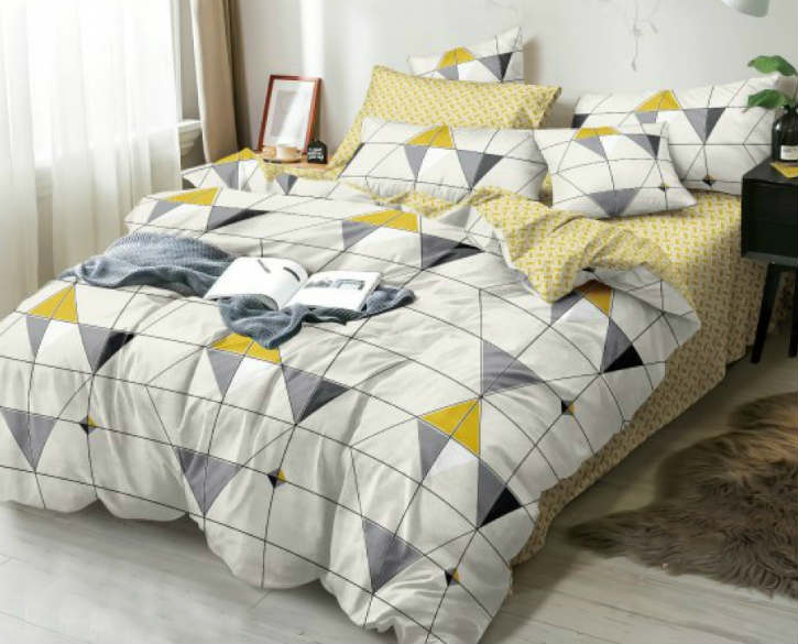 У модели ST258 простынь и низ пододеяльника горчичные а верх светло-серый с треугольниками.