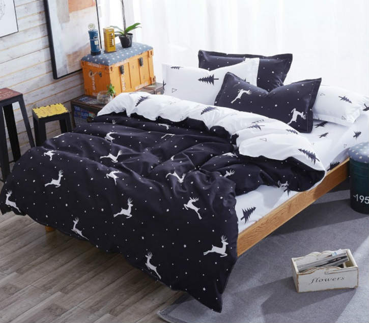 У модели ST261 простынь и низ пододеяльника белые с чёрными ёлочками а верх чёрный с белыми оленями.
