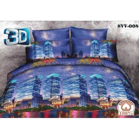 3Д комплект "SVV-008" в синеих вечерних тонах с объёмным изображением небоскрёбов выполнена из прочной хлопчатобумажной ткани, устойчивой к стирке в горячей воде до 90 градусов.