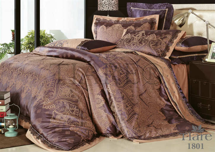 Модель 1801 имеет яркую окраску и выполнена в небесно-голубом цвете с бежевым причудливым узором. Пододеяльник без канта, вышивки и кружев. Двухсторонний: верх жаккардовый, низ из однотонного гладкокрашенного сатина. Простынь также без рисунка.