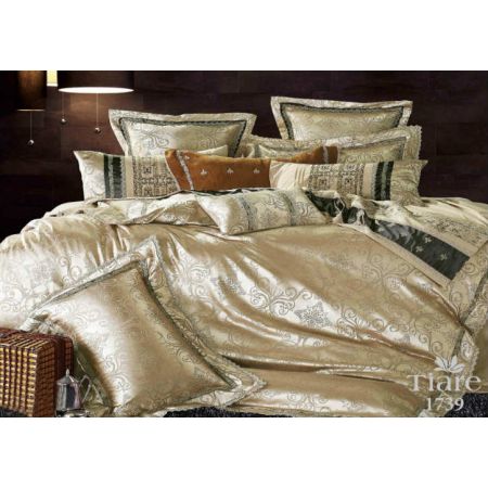 Модель 1739 выполнена в бежевом цвете с серебристым причудливым узором. Пододеяльник без канта, вышивки и кружев. Двухсторонний: верх жаккардовый, низ из однотонного гладкокрашенного сатина. Простынь также без рисунка.