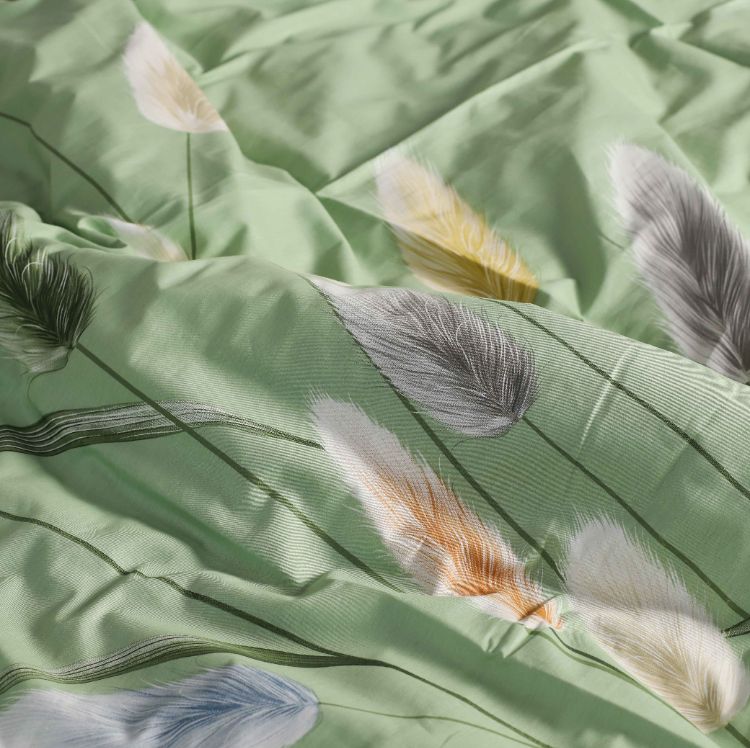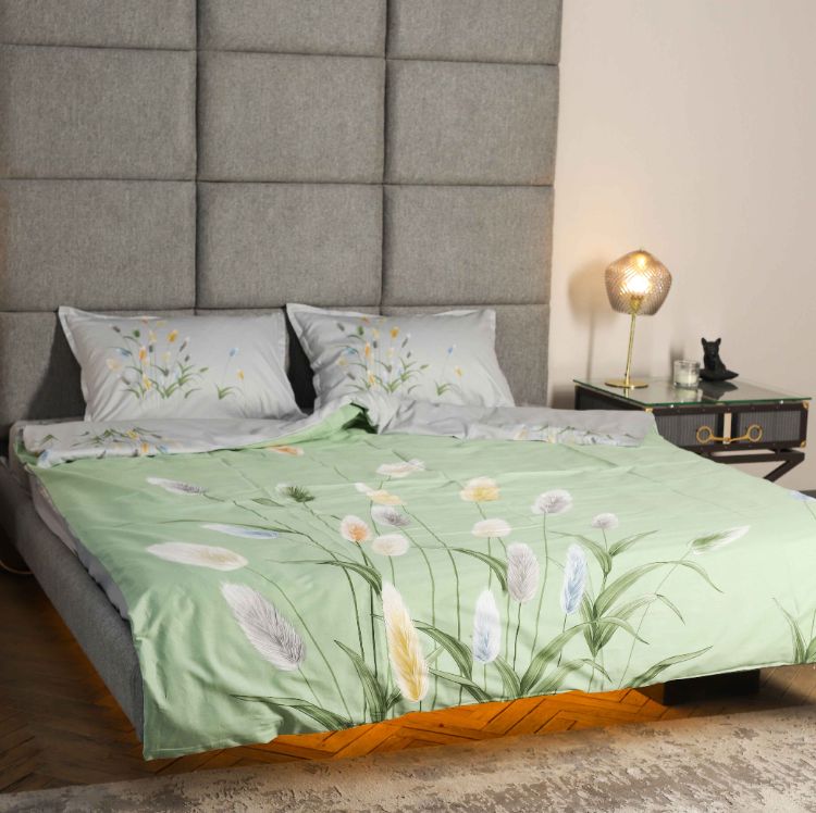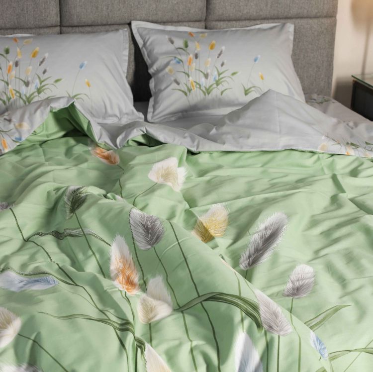 Модель 116 с объёмным изображением 3д цветущего камыша на зелёном фоне. Простыня и низ пододеяльника серые.