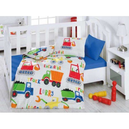Комплект Santiye Mavi имеет синюю простынь и белый пододеяльник с изображением грузовичков и экскаваторов.