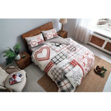 Модель "Savina Red" в неярких тонах. Пододеяльник двухсторонний: одна сторона, как и простыня в мелкую светло-серую клетку; вторая в тон наволочкам - бело-серая с красным рисунком в виде сердца.