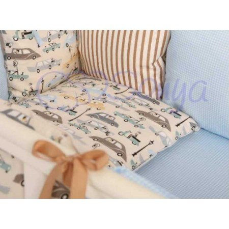 Модель для мальчика серии Beby Design Premium "Машинки" выполнена из комбинированных расцветок. Простыня на резинке нежно голубого цвета в клеточку. Двусторонний пододеяльник с одной стороны в полосочку, а с другой усеян множеством автомобилей. Наволочка пошита из такой же ткани, как и верх пододеяльника.