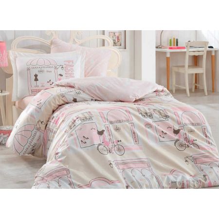 Модель для девочек Sonia Pembe окрашена в белые и розовые тона с изображением девочки на велосипеде. Изготавливается в полуторном размере.