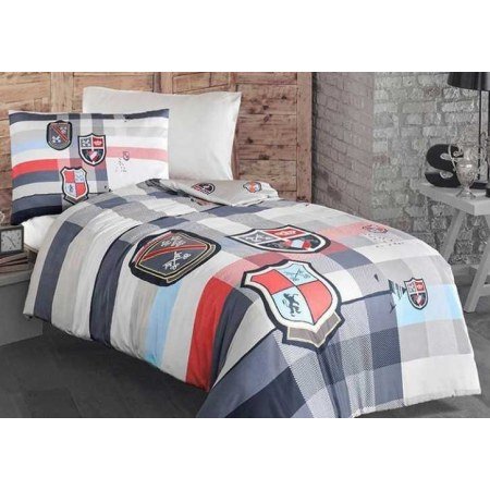 - двухсторонний пододеяльник 160х220 см с одной стороны с крупными гербами на фоне серых, голубых и красных клеток, а с другой - с мелкими значками клубов на сером фоне.