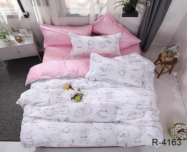 У модели R4163 простынь и низ пододеяльника розовые, а верх белый с кроликами.