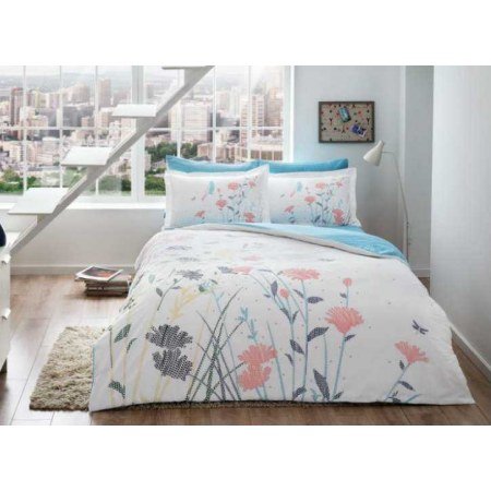 У модели Talia Kirmizi голубая простынь и низ пододеяльника. Верх пододеяльника белый с серыми и красными цветами. В темноте цветы светятся.
