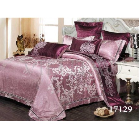 Модель 17129 имеет благородную окраску и выполнена в нежном розовом цвете с бордовой вставкой. Пододеяльник без канта, вышивки и кружев. Двухсторонний: верх жаккардовый, с белесыми узорами и тёмной сливовой вставкой по верху, низ из однотонного гладкокрашенного сатина розового цвета. Простынь также без рисунка однотонная.