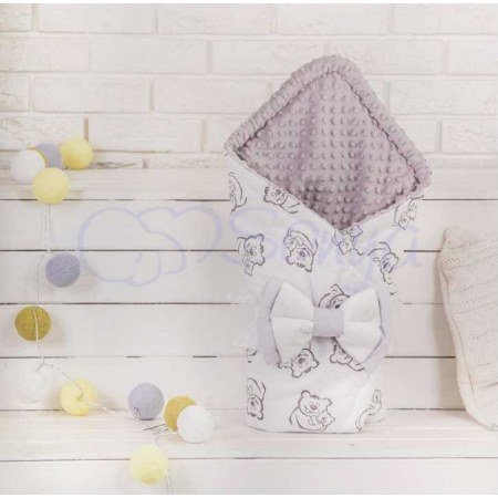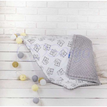 Модель Minky "Тилли Милли" двусторонняя: с одной стороны изделие из натуральной хлопковой ткани белого цвета с изображением мишек, а с другой - мягкая плюшевая подкладка из польской ткани серого цвета. Подходит для мальчика.