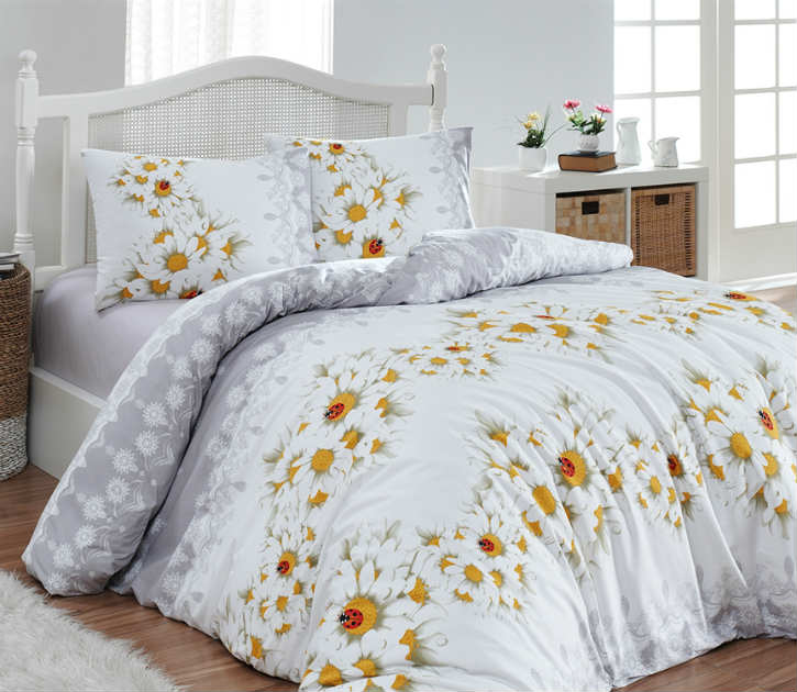 Модель Ladybugs с ромашками и божьими коровками на белом фоне бежевого цвета выполнена из мягкого хлопчатобумажного материала. Простыня серая.