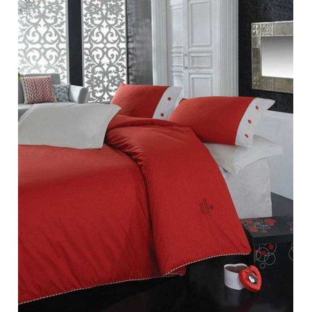 Комплект постельного белья Plain Kirmizi пошит турецким производителем Cotton Box из однотонного ранфорса двух цветов - красного и серого с эксклюзивной надписью и необычайно элегантными наволочками придаст спальне неповторимую атмосферу спокойной размеренности и королевского величия.