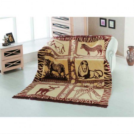 Плед «Safari» имеет светло-коричневую расцветку с изображением африканских животных и представлен в размере 150 на 200 сантиметров.