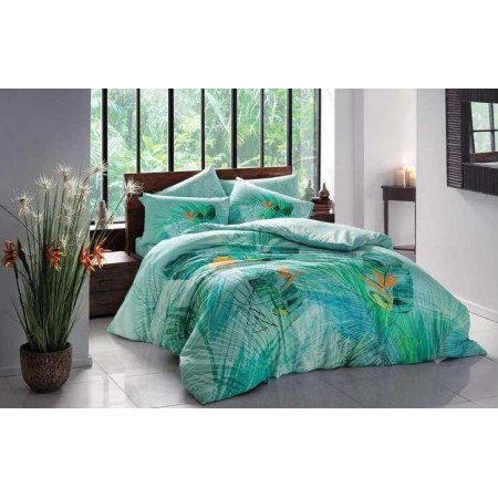 Модель "Bahama V01 Mavi" выполнена в яркой бирюзовой расцветке. Однотонная простынь и низ пододеяльника. Верх пододеяльника окрашен в листья разных оттенков зелёного и голубого цвета.