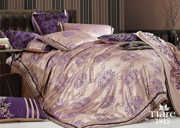 Модель 1915 тёмно-бежевого цвета с фиолетовым узором. Пододеяльник без канта, вышивки и кружев. Двухсторонний: верх жаккардовый, низ из однотонного гладкокрашенного сатина. Простынь также без рисунка.