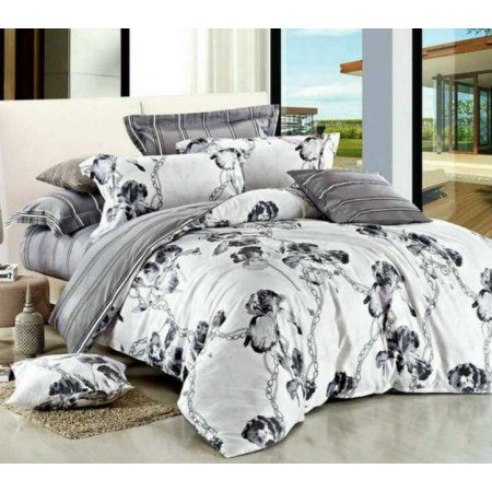 Модель выполнена в светлых и тёмных тонах серого цвета. С одной стороны пододеяльник и две наволочки изящно обвиты тёмно-серыми цветами, а вторая сторона, как и простыня, в полоску.