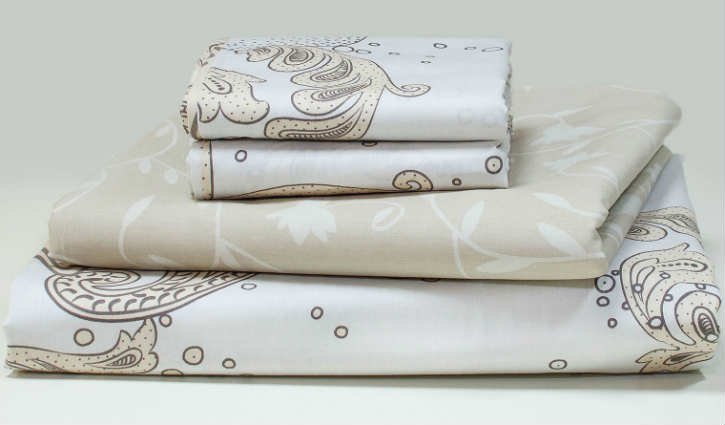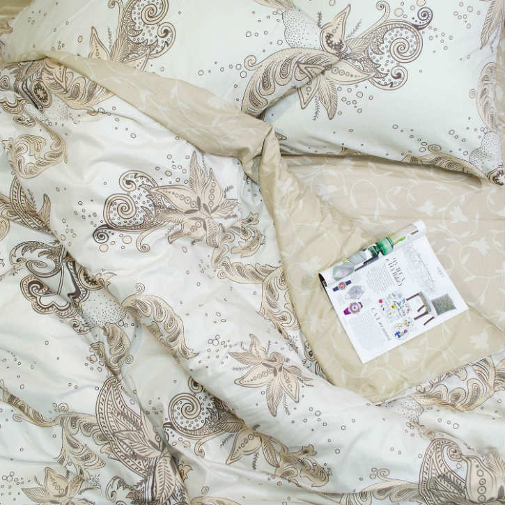 Одна сторона двухстороннего пододеяльника пошита в тон наволочкам с узорами на кремовом фоне, а вторая, как и простыня, из материи бежевого цвета.