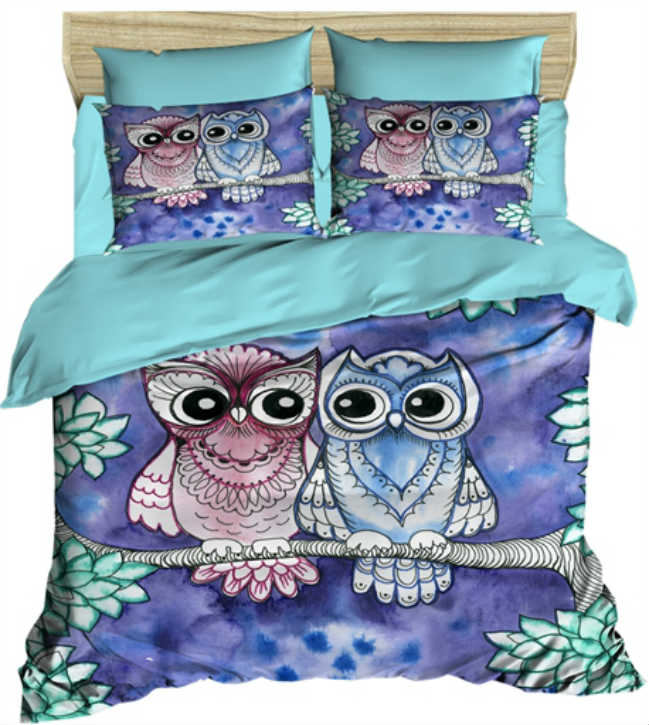 Модель Night Owls выполнен в светлых тонах с объёмным коллажем из перьев на пододеяльнике.