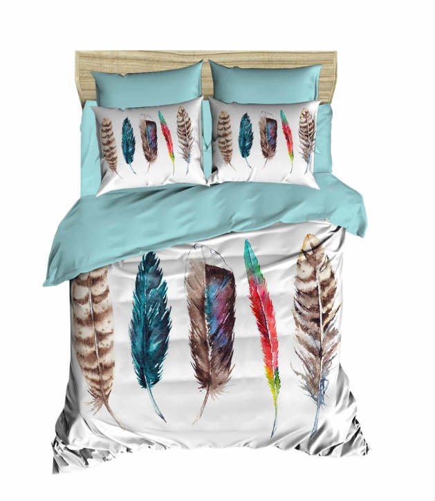 У модели Indian Summer бирюзовая простынь и низ пододеяльника, а верх белый с объёмным изображением ярких перьев.